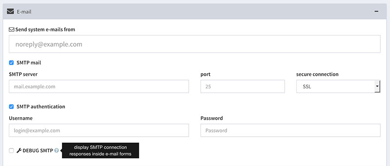 File sharing, New user notification and Password Recovering use PHPmailer, with the possibility to choose between the php mail() funcion (default), or SMTP mail.