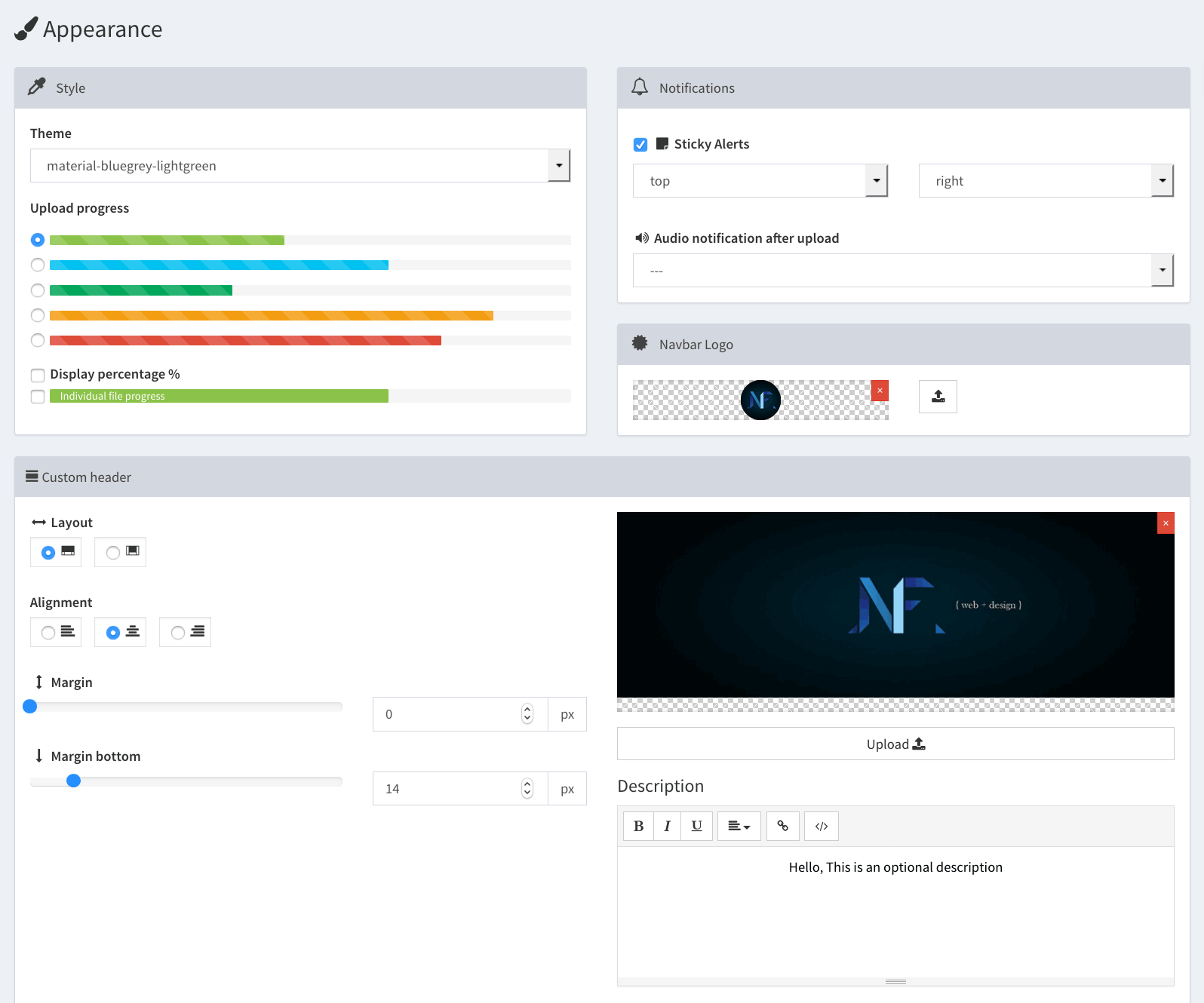 The panel Appearance includes a Skin selector, a customizer, and the options for the notification alerts